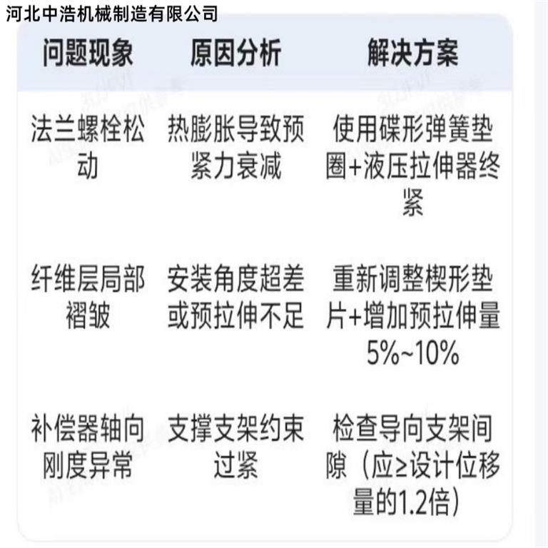 纖維織物補(bǔ)償器在安裝時(shí)避免不了安裝誤差,為了解決安裝誤差問(wèn)題中浩機(jī)械總結(jié)主要可從安裝前零誤差測(cè)量和定位到預(yù)變形量調(diào)整,其次對(duì)支撐結(jié)構(gòu)進(jìn)行優(yōu)化,分階段緊固與應(yīng)力調(diào)整,安裝后進(jìn)行試驗(yàn)測(cè)試,從而總結(jié)常見問(wèn)題及解決方法。